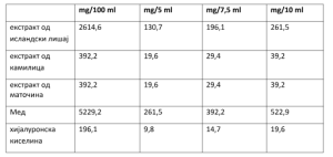 (Lichen islandicus)(2%); екстракт од цвет од камилица (Chamomilla recutita) (0,3%); екстракт